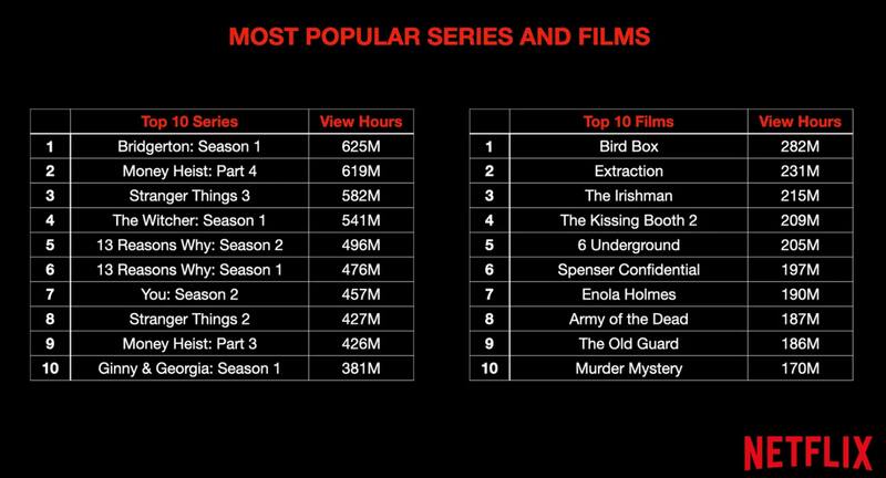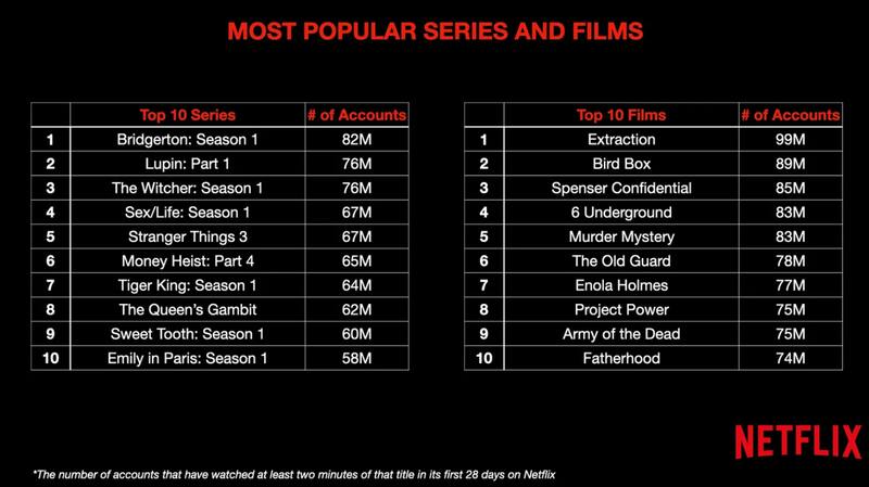 De acuerdo a estas cifras recogidas por The Verge, al considerar las cuentas que han visto por lo menos dos minutos del contenido durante sus 28 días primeros días en Netflix, la primera temporada de Bridgerton y la película Extraction lideran la medición de popularidad ya que congregaron a 82 y 99 millones de cuentas respectivamente.
