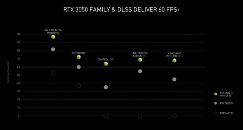 Desde Nvidia, anunciaron que aunque tiene menor potencia que las otras tarjetas de la familia, en juegos como Call of Duty: Warzone, la RTX 3050 Ti puede alcanzar los 80 fps en 1080p, con gráficas a medio, y puede alcanzar los 95 fps al activar el DLSS. En comparación con tarjetas anteriores, como la GTX 1650 Ti, el juego alcanzaba los 55 fps en Warzone.