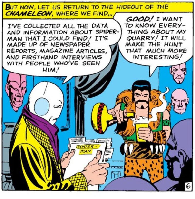 Al mismo tiempo, el villano se hace pasar por Spider-Man, causando estragos para eludir a la justicia, mientras intenta robar planos secretos para vendérselos a países de “la cortina de hierro”. Obviamente los planes del Camaleón son arruinados por Spidey, pero es su rivalidad con el héroe lo que lleva directamente al debut de Kraven, quien fue convocado en Amazing Spider-Man #15.