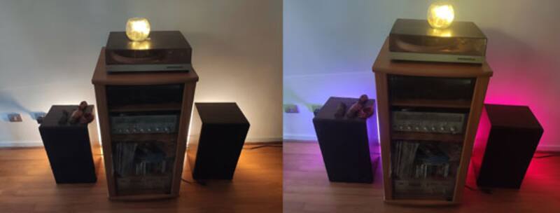 Solo para que se hagan una idea, la siguiente imagen da cuenta de cómo iluminan las Hue Play sin el bridge (a la izquierda) y cómo lo pueden hacer cuando tienes el control completo de su sistema (derecha).