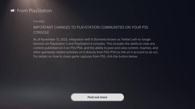El comunicado le está apareciendo en la pantalla a algunos usuarios, y en este mencionan que “a partir del 13 de noviembre finalizará la integración de X (anteriormente conocida como Twitter) en las consolas PlayStation 5 y PlayStation 4″.