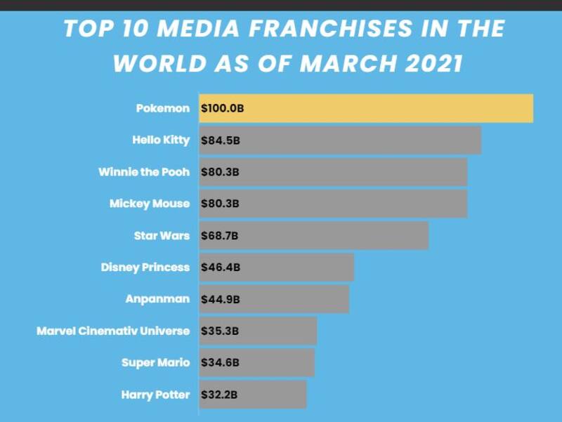 Según el informe, la popular franquicia supera de esta forma a otras importantes franquicias como Hello Kitty, Winnie de Pooh, Mickey Mouse, Star Wars, el Universo Cinematográfico Marvel, y Harry Potter.