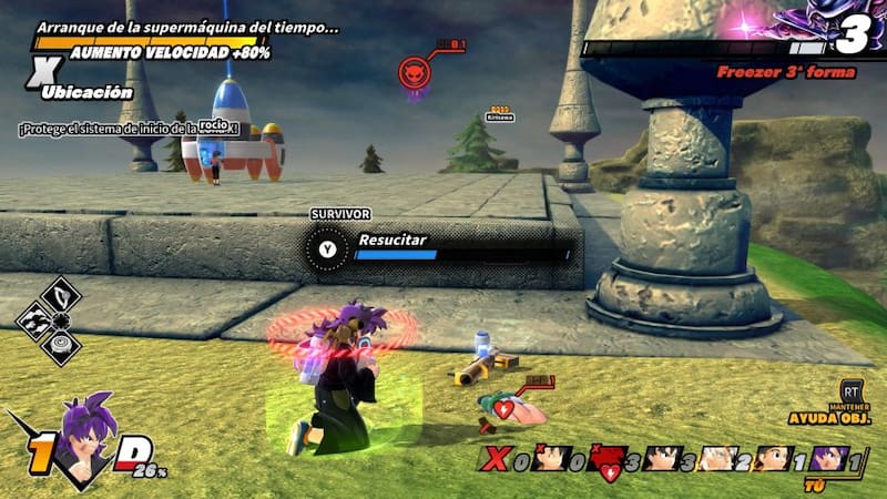 Pero vamos al juego, la trama del juego, y como es de esperar de un multijugador isométrico, queda relegada casi por completo a un segundo plano, aquí nos encontramos por cosas del destino con Trunks, y luego nos vemos atrapados en estas grietas de espacio tiempo que son cada una de las partidas, donde villanos como Freezer o Cell están destruyendo todo, y nuestro objetivo es eliminarlo o en su defecto escapar.