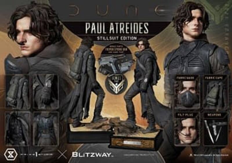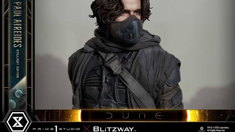 “Prime 1 Studio se enorgullece en presentar esta impresionante estatua de 21 pulgadas de altura en una espléndida colaboración con Blitzway. Paul Atreides se encuentra en el desierto abierto, mirando hacia su futuro incierto en este nuevo mundo. Está vestido con su Fremen Stillsuit, con botas calzadas sin cordones. Un estilo del desierto”, declara la tienda.