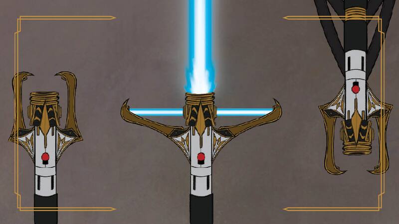 “El sable de luz de Gios es un arma elegante con una empuñadura cruzada y más larga que le permite manejarlo fácilmente con las dos manos como si fuera una espada ancha. Los quillons de la cruceta apuntan hacia adelante cuando el sable no está en uso, y el arma descansa en una funda que deja el sable fácilmente accesible. La empuñadura cuenta con llamativos detalles en negro, dorado y plateado. Luego, el sable se enciende, las cuchillas de la cruceta empujan los quillons hacia afuera, formando tapas en las cuchillas y creando una guardia secundaria”, apuntan sobre el sable en el sitio.