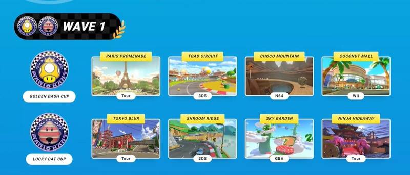 La primera ola de pistas incluirá dos copas con cuatro carreras cada una, y en futuro llegarán otras cinco oleadas de pistas a fines del 2023. La primera llegará el 18 de marzo y contará con circuitos de Mario Kart para dispositivos móviles, Nintendo 3DS, Nintendo 64, Wii, Nintendo DS y Game Boy Advance. Míralas a continuación:
