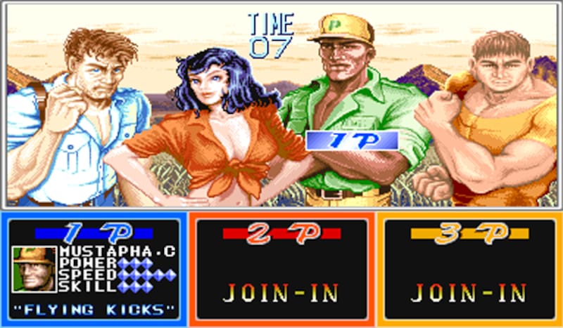 Con la particularidad de permitir hasta tres jugadores, en la línea de Final Fight, las alternativas para la elección de nuestros personajes eran variadas, pues podíamos tomar control del mecánico Jack Tenrer, la ágil exploradora Hannah Dundee, el elusivo pero fortachón Mess O’Bradovich y el más popular de todos por este lado del mundo, el ingeniero dueño de la patada voladora, Mustapha Cairo.
