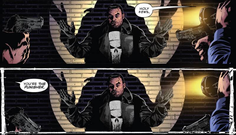 A continuación, The Punisher los amenaza, ya que si copian sus acciones, vendrá por ellos. Y es que los policías que actúan fuera de la ley también son sus enemigos. Por eso este cómic planteó una postura clara: no usen como ejemplo a Frank Castle ni menos utilicen su clásico logo.