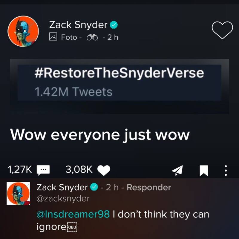 Por supuesto, esta nueva campaña no tardó en llamar la atención de Zack Snyder, quien a través de la red social Vero compartió una captura de pantalla que apunta a más 1.4 millones de tweets sobre #RestoreTheSnyderVerse.