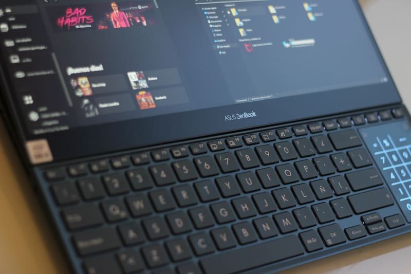 El teclado que acompaña al Zenbook Pro Duo 15 OLED, es retroiluminado de color blanco, el cual cuenta con algunas teclas de acceso rápido que facilitan el uso como la que permite intercambiar lo que tenemos en la pantalla principal por los elementos en la secundaria, o la que deshabilita el ScreenPad. Este teclado como ya se ha vuelto una norma en esta línea, aunque no tiene un teclado numérico físico, puede transformar su trackpad en uno de estos con un sólo click, con lo cual no tendrás mayores problemas si es que lo usas regularmente.