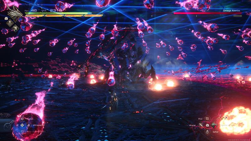 Los enemigos de esta forma rondan entre estos niveles y aunque en gran medida se mantienen, en lo que respecta a dificultad, similar a lo que es el juego base, todo cambia cuando llegamos al jefe final, Omega. Lo primero que hay que mencionar es que Omega es un jefe secreto recurrente de la saga Final Fantasy, el cual tuvo su primera aparición en Final Fantasy V y recientemente lo pudimos ver en entregas como Final Fantasy XIV y Final Fantasy XV. Tal como había ocurrido con el juego base, que tomaba ciertos elementos del combate contra jefes de Final Fantasy XIV Online, el combate contra Omega se sentirá como una de estas batallas, con una serie de pilares, donde el posicionamiento y el buen uso de las habilidades será necesario.
