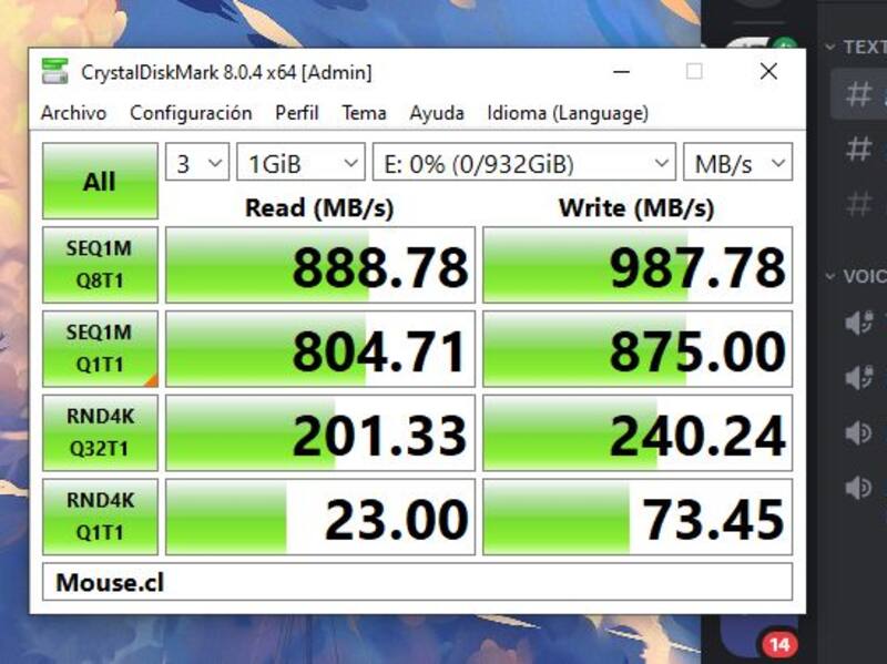 En cuanto a lectura secuencial, este dispositivo ronda los 900 MB/s en lectura y 987 MB/s en escritura, cifras que andan bastante bien y están en línea con lo que nos indica el fabricante que dice que puede alcanzar velocidades de hasta 1050 MB/s. Con esto es que las velocidades nos permitirán traspasar archivos con bastante rapidez y es probable que se le pueda sacar un poco más en condiciones más óptimas, pero dada que la diferencia es tan poca con lo que dice el fabricante para un test simple de plug-and-play, está más que bien.
