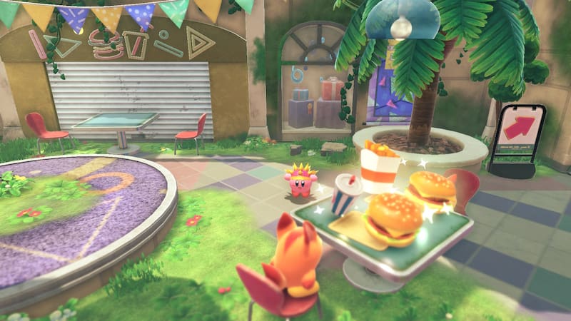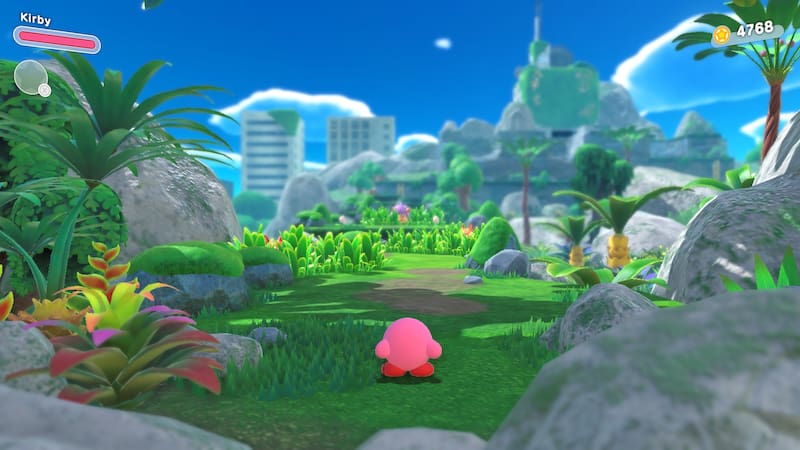 Solo a través de la gracia y la dirección artística de la gente detrás de Kirby podemos encontrarnos con un planeta en un estado post-apocalíptico, pero que sigue siendo brillante, colorido y lleno de personalidad. En nuestra aventura nos encontraremos con ciudades llenas de maleza, parques de diversiones abandonados, hoteles en medio del desierto, playas infestadas de criaturas y hasta un centro comercial con patio de comidas y todo.