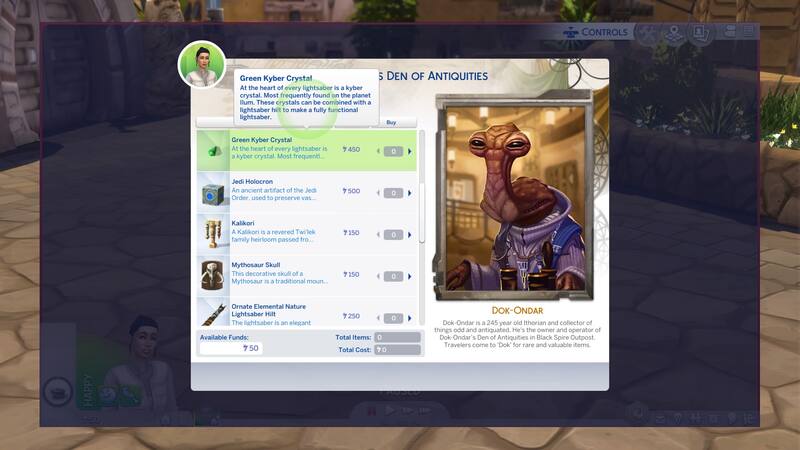 No obstante, lugares que suenan llamativos en el papel como Dok-Ondar’s Den of Antiquities, la tienda de antigüedades que vende elementos para lightsabers e incluso tiene reliquias Jedi en su exterior, solo entran en juego para realizar compras que son ejecutadas por los sims fuera de pantalla.