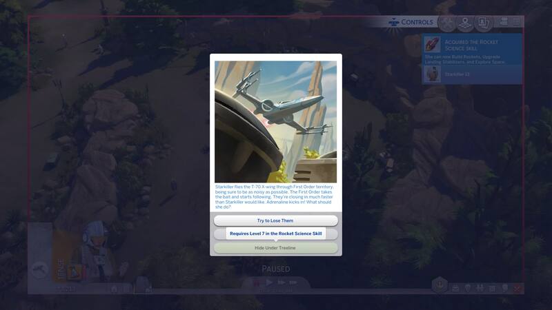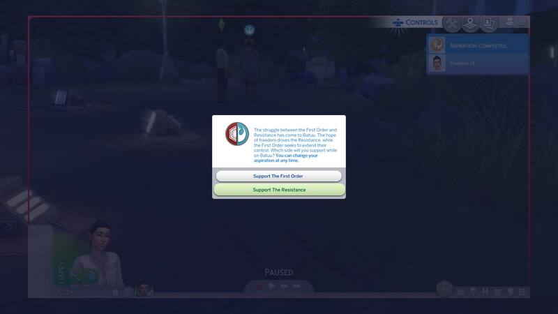 Como señalamos anteriormente, Los Sims 4 Star Wars: Viaje a Batuu tiene un arranque lento ya que poco a poco debes ganar confianza en el área del conflicto que elijas. Personalmente escogí a la Resistencia porque quería averiguar qué pasaba al interactuar con el X-Wing (Spoiler: Fue algo decepcionante).