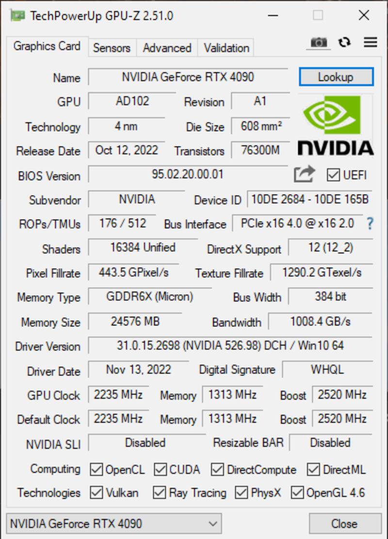 Con la RTX 4090 nos encontramos frente a una tarjeta construida sobre la arquitectura Ada Lovelace, con 24 GB GDDR6X de memoria dedicada y una velocidad de transferencia de 1008 GB/s. Junto con esto, es que viene acompañada de 16.384 núcleos Cuda, 128 núcleos RT y 512 núcleos Tensor, todos números más altos que las tarjetas predecesoras que por ejemplo que en el caso de la RTX 3090 TI poseía 10.752, 84 y 336 respectivamente.