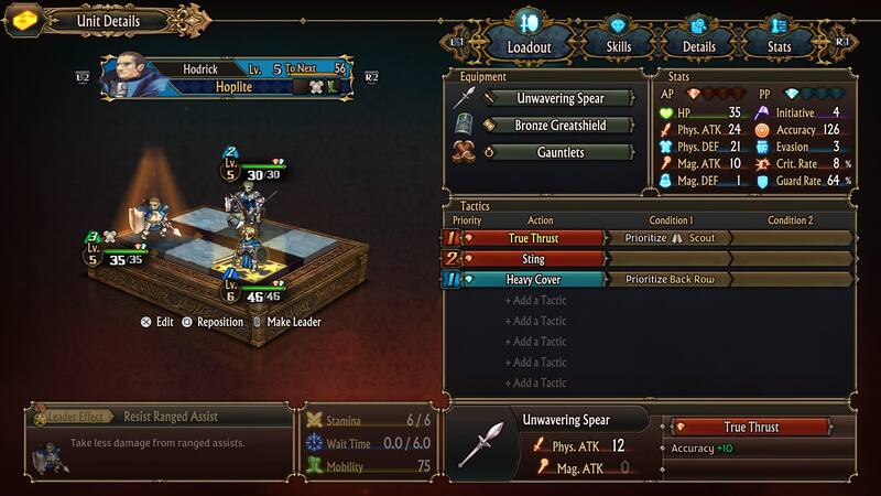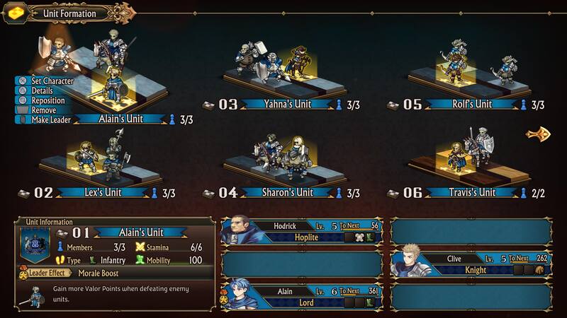 El combate nos presenta un sistema en donde contaremos con una serie de unidades las cuales podremos desplegar al momento de la batalla y estarán compuestas por seis casillas donde podremos poner nuestros personajes. Cada personaje tiene sus propias estadísticas, habilidades, debilidades y resistencias, además, dependiendo de la posición en que estén dentro de la unidad pueden defender a otros o estar más guarecidos. En estas unidades, desde el posicionamiento, la combinación de unidades, y hasta quien es el líder influye en su desempeño, por lo que tienes múltiples opciones para probar, ver las mejores sinergias y cuáles unidades funcionan mejor junto a otras.