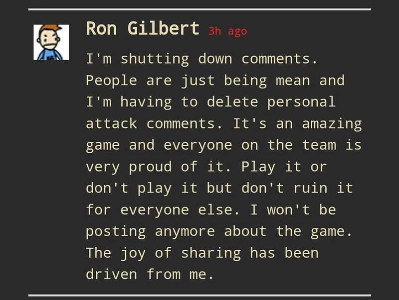 El apartado del blog de Gilbert con ese mensaje ya no está disponible. No obstante, la declaración del creador fue compartido a través de Twitter por Dominic Armato, el actor tras Guybrush Threepwood.