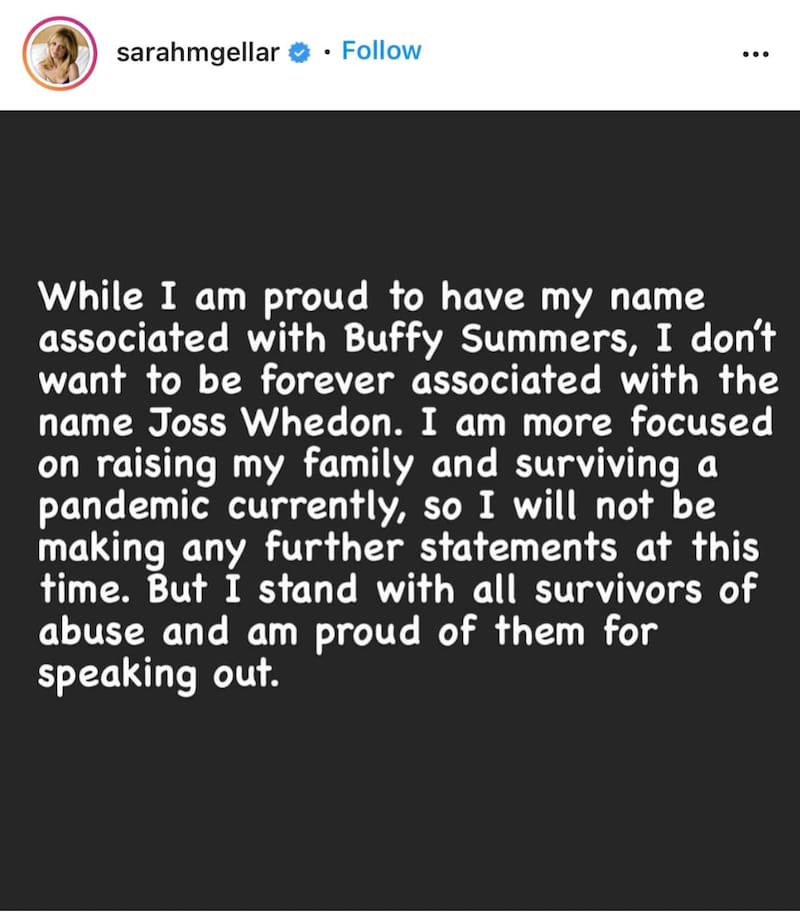 “Si bien estoy orgullosa de que mi nombre esté asociado con Buffy Summers, no quiero que me asocien para siempre con el nombre de Joss Whedon”, escribió Gellar. “Estoy más concentrada en cuidar a mi familia y sobrevivir a una pandemia actualmente, por lo que no haré más declaraciones en este momento. Pero estoy con todos los sobrevivientes de abuso y estoy orgullosa de ellos por hablar”.