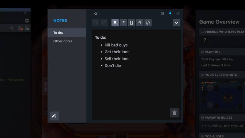 “La nueva aplicación Notas te permite anotar ideas sobre el juego que estás jugando. Viene con formato de texto enriquecido, con la posibilidad de crear varias notas por juego, y se puede usar en modo desconectado. Estas notas se guardan por juego, se sincronizan entre los equipos en los que tengas sesión iniciada y también están disponibles fuera de la interfaz de Steam dentro del juego, en la página de detalles del título”, mencionan desde Valve.