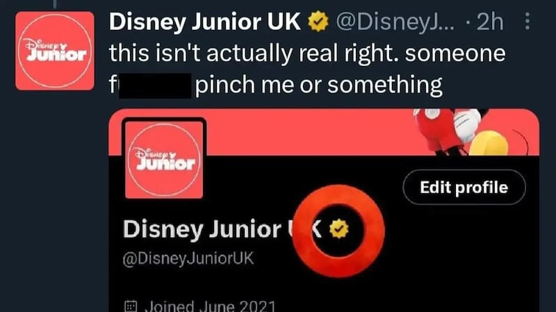 Pero como esto es internet naturalmente alguien se apoderó el nombre de usuario “Disney Junior UK” y lo que simpelemente pudo quedar como una parodia más escaló a otro nivel cuando este fin de semana Twitter le entregó a la cuenta falsa la misma verificación dorada que a las cuentas reales de Disney y otras empresas.