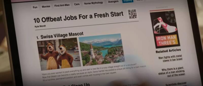 Como podrán ver en la imagen que está a continuación, cuando She-Hulk: Attorney at Law muestra brevemente la pantalla del computador de Jennifer no solo se puede ver que la protagonista estaba buscando trabajos no tradicionales para comenzar desde cero que incluían un empleo como corpóreo en Suiza, sino que al costado del sitio web se puede apreciar una publicidad de zapatillas de Iron Man y vínculos a otros artículos que dicen: “Hombre pelea con garras de metal en un bar” y “Por qué hay una estatua gigante de un hombre saliendo del océano”.