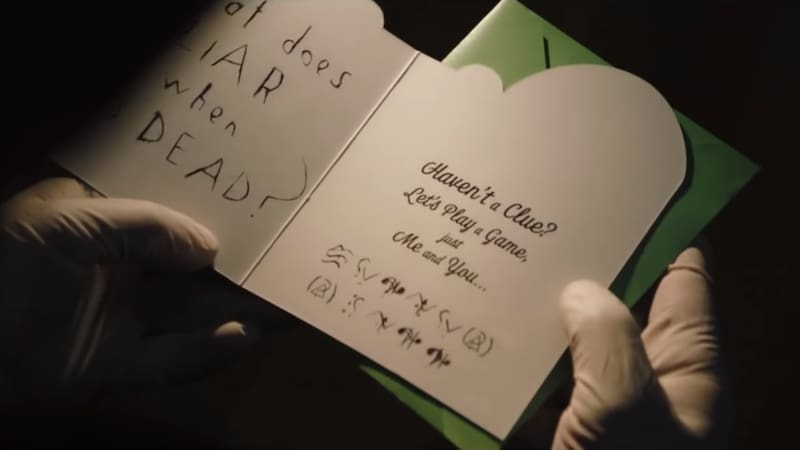 La carta dirigida a Batman dice en un costado “¿Qué hace un mentiroso cuando está muerto?” y al otro lado afirma: “¿No tienes idea? Juguemos, solo tú y yo”, antes de dar pie a un misterioso código.