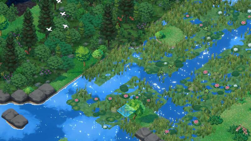 A partir de ahí, nos movemos por este terreno desolado recuperándolo sector por sector hasta que podemos avanzar a la siguiente fase, en donde podemos atraer abejas para florecer el terreno e inclusive crear humedales. También se pueden crear incendios controlados para fertilizar la tierra y lograr plantar bosques.