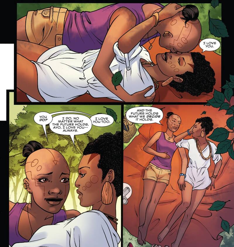 De hecho, en la etapa de Black Panther escrita por Ta-Nehisi Coates se abordó una relación entre Ayo (quien es interpretada en el MCU por Florence Kasumba) y Aneka, un personaje que aún no aparece en las series y películas de Marvel Studios pero que según un rumor (que no ha sido confirmado ni respaldado por otros reportes) podría corresponder al papel de Michaela Coel.