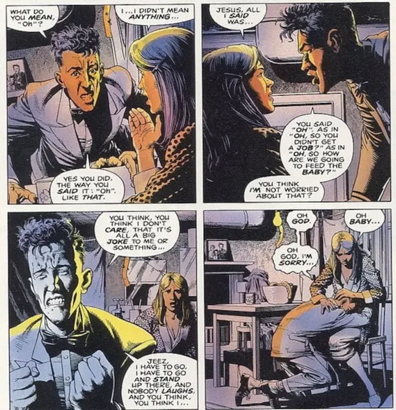 Otra secuencia recupera un momento de “La Broma Asesina” entre el Joker y su esposa embarazada, antes de la transformación. Viñetas que lo muestran como un tipo afectuoso y preocupado, pese a su total fracaso como comediante.