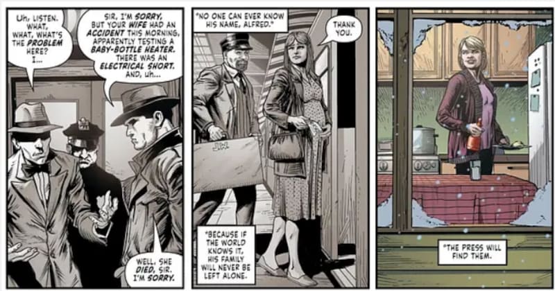 Pero lo realmente importante a la larga es que Batman no solo termina revelando que conoce la verdadera identidad del villano, y explica que ese nunca fue el tema mayor, ya que él sí conoce un secreto oculto que el propio villano desconoce... su esposa sigue viva y su hijo creció, sano y salvo.