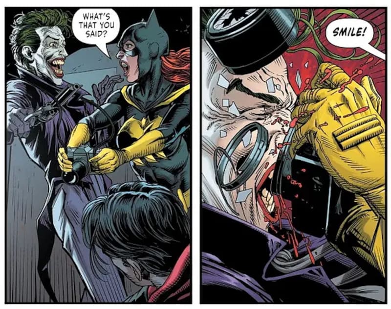 De partida, Batgirl obtiene su propia revancha destruyéndole la cámara fotográfica a uno de los tres Jokers. En la historia original de 1988, el villano utilizó la cámara para sacarle fotografías a una Barbara Gordon conmocionada tras recibir el disparo que la dejó paralítica por décadas. No pocos han visto en ese momento una notoria sugerencia a un abuso sexual cometido por parte del villano.