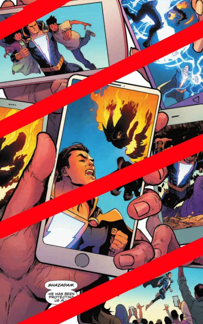 Como podrán ver a continuación, estas fotos de Infinite Frontier #0 muestran que un montón de personas le dicen a Superman que fueron rescatadas por “Shazadam”. Superman naturalmente cree que se están refiriendo a Shazam, sin embargo, cuando las personas le muestran las fotos que tomaron con sus teléfonos se revela que ellos le dicen “Shazadam” a Black Adam.