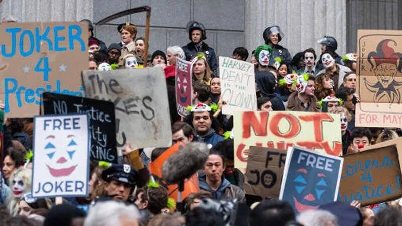 Extras han sido capturados portando pancartas con lemas como "Liberen al Joker", "Joker para Presidente", "Joker para alcalde" y "Harvey Dent es el payaso".