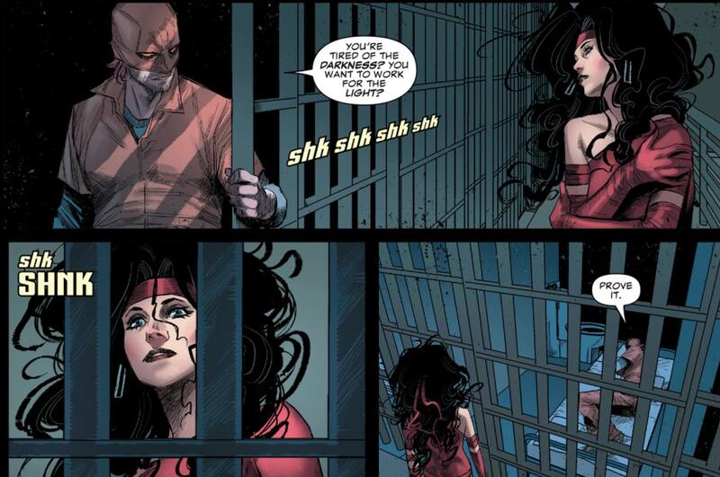 En ese cómic Elektra visitó a Matt en la prisión y lo recriminó por el acuerdo que lo llevó allí. La ex- pareja del héroe planteó que Murdock estaba siendo irresponsable con su misión al permanecer en la cárcel mientras la gente lo necesitaba, sin embargo, el abogado apuntó a que la relación entre ellos no estaba en un punto para hablar de deberes y misiones tras todo lo que había pasado con los planes de Hell’s Kitchen.