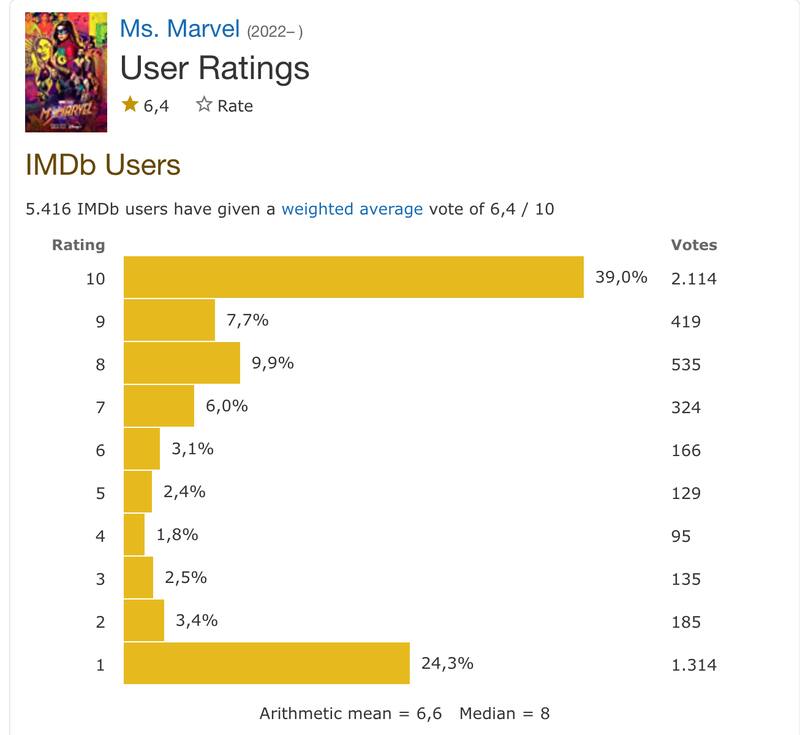 Poco después del estreno de Ms. Marvel algunos fanáticos comenzaron a apuntar a las valoraciones de la serie que se pueden ver en IMDb y curiosamente oscilan entre puntuaciones perfectas y la peor calificación.