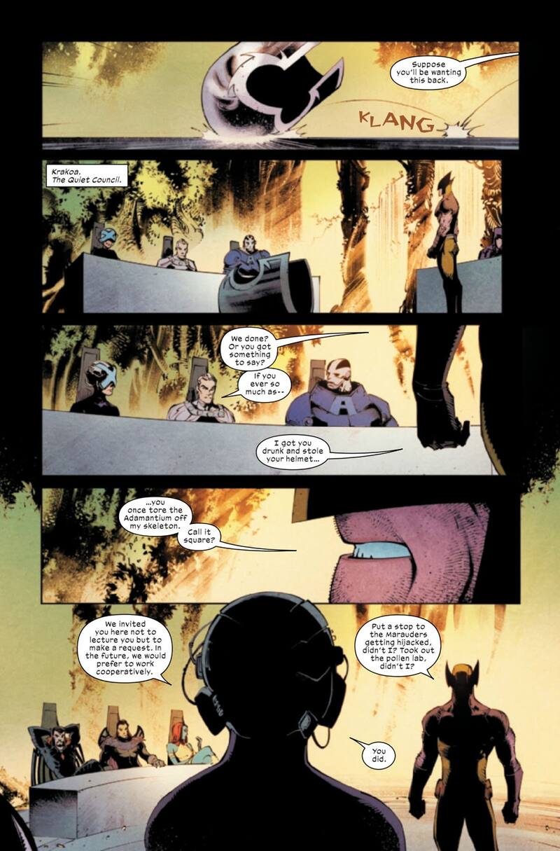 Pero aunque las acciones de Wolverine tenían una explicación, las autoridades del Quiet Council de Krakoa vieron con malos ojos el robo del casco de Magneto y en Wolverine #4 obligaron a Logan a devolverlo.