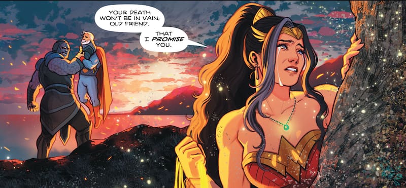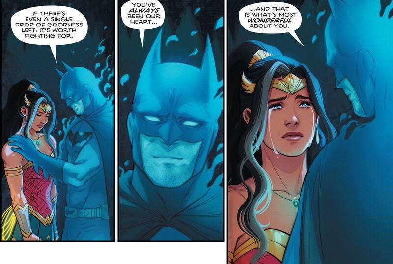 De ahí en más Diana conversa con una especie de visión de Batman, quien la reconforta señalando que él tenía claro como terminaría su misión y que ella siempre fue el corazón de los héroes por lo que, aunque ahora está prácticamente sola, deberá pelear para mantener la bondad que lucharon por preservar durante tanto tiempo.