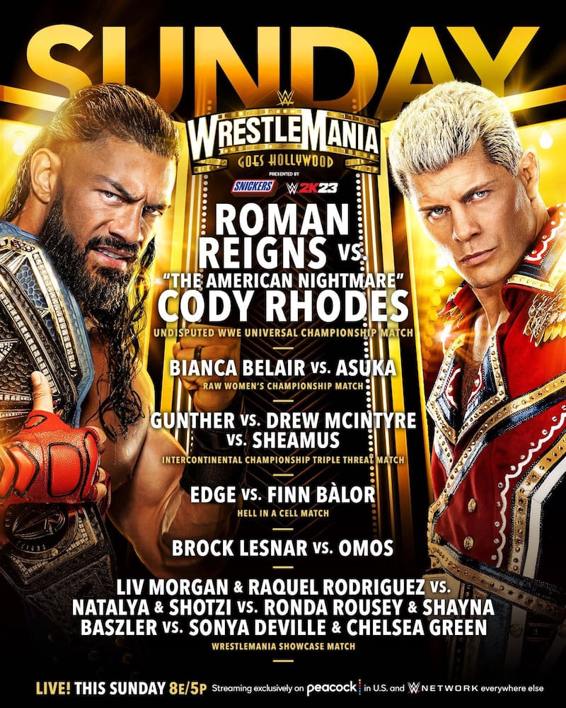 La denominada vitrina de los inmortales se llevará a cabo en el SoFi Stadium, hogar de Los Angeles Rams y Los Angeles Chargers de la NFL, durante este sábado 1 de abril y el domingo 2 de abril, teniendo como foco más importante la resolución de la historia del equipo conocido como The Bloodline. Es decir, tanto Roman Reigns, el indiscutido campeón universal de la WWE, como The Usos, los campeones indiscutidos de los campeonatos en pareja de RAW y Smackdown, pondrán sus títulos en juego ante rivales como Cody Rhodes y el dueto conformado por Sami Zayn y Kevin Owens.