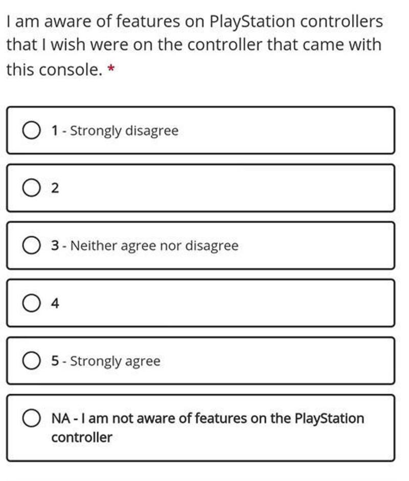 Es así, como los jugadores recibieron una encuesta donde se les pide que clasifiquen la experiencia con las nuevas consolas, y apunten los diferentes elementos que se podrían mejorar a futuro. Es en este ámbito que pregunta si estás familiarizado con el control de PlayStation y si te gustaría que sus características se sumaran al control de Xbox.