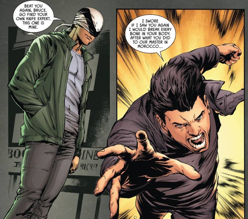 Como parte del flashback, ambos se enfrentan brevemente, estableciendo que tienen maestros en común y han entrenado juntos, pero Bruce, sin entrar en detalles, explica que nunca perdonará lo que el Ghost-Maker hizo con el maestro de Marruecos.