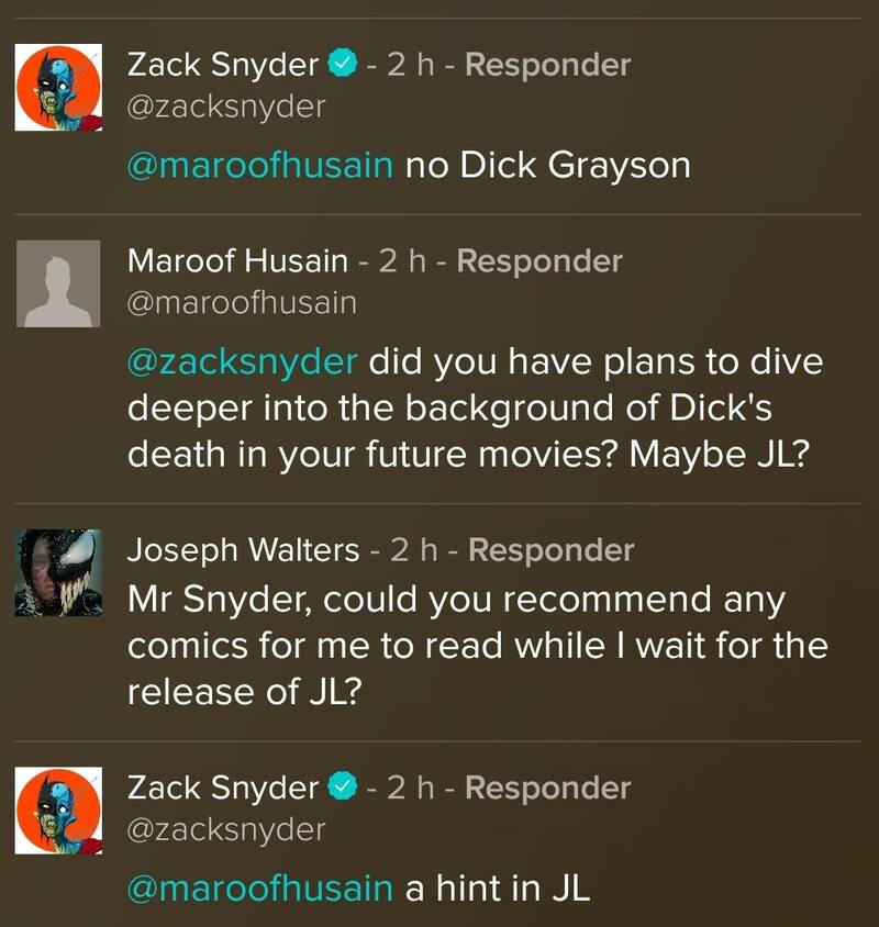 Particularmente un usuario le preguntó a Snyder si en realidad se refería a Jason Todd cuando un par de años atrás declaró que Dick Grayson era el Robin que portó el traje vandalizado por el Joker y murió antes de los eventos de Batman vs Superman.