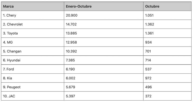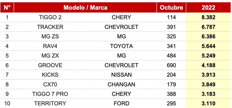 En cuanto a marcas, el top ten acumulado en los primeros 10 meses del año prácticamente no varió y sigue encabezado por Chery, que superó las 20 mil unidades y estableció una diferencia que parece irremontable para Chevrolet o Toyota. El único movimiento de los 10 SUV más vendidos se apreció entre Kia y Peugeot, que enrocaron posiciones frente al acumulado que existía hasta septiembre.