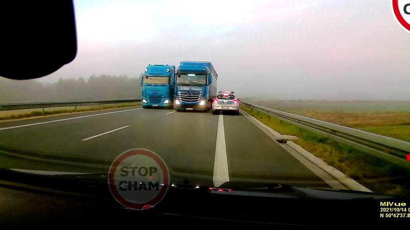 El hecho fue registrado en Polonia. El radiopatrulla debió orillarse de emergencia para evitar el embiste del camión.