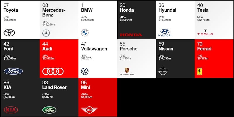 Completan el ‘top 5’ de marcas más valiosas: BMW, que ocupa el puesto 11 en la clasificación general (39.756 millones de dólares, -4%); Honda, en el 20 (21.694 millones, -11%); y Hyundai, que se posiciona en la plaza 36 (14.295 millones, +1%).