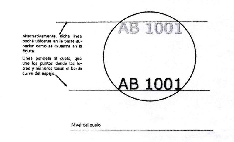 - En los espejos laterales cuya forma sea o se aproxime a un cuadrado o a un rectángulo el grabado se realizará siguiendo el borde de sus lados paralelos al suelo, de la forma más próxima a dicho borde. En los espejos laterales cuya forma sea circular u ovalada, el grabado se realizará de forma paralela al suelo, en una línea que une los puntos donde las letras y dígitos tocan el borde curvo del espejo (ver figura siguiente). En ambos casos el grabado puede realizarse en la parte superior o inferior y no debe interferir con su función.