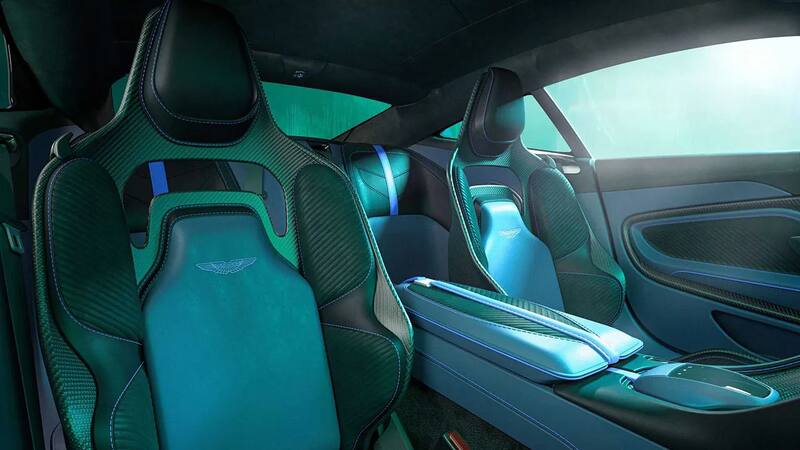 Puertas adentro, se evidencian nuevos tratamientos en su diseño pero que conserva el reconocible habitáculo del DBS actual. Se equipa con asientos Sports Plus tapizado en cuero de semianilina y alcántara, las levas de cambios están hechas de fibra de carbono y unas placas en los umbrales muestran el número de la unidad y su respectivo nombre.
