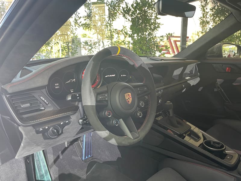 Puertas adentro destaca su parte superior del tablero en Race-Tex, cinturones de seis puntos para conductor y acompañante, levas de cambios de la caja PDK en el volante con tecnología magnética, jaula antivuelco optimizada hecha de CFRP visible.
