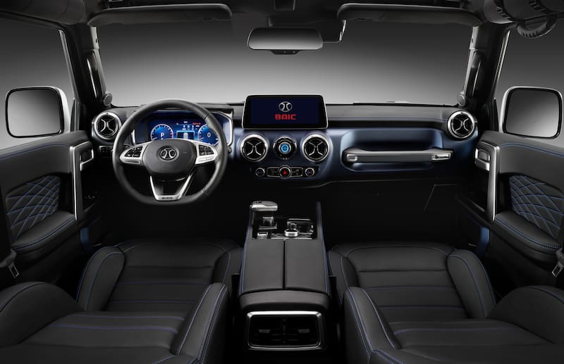 Destaca su tablero digital de 12,3′' con información multimedia, presión de ruedas e información de conducción Off-Road (ángulos de inclinación lateral y longitudinal), además de una pantalla táctil de 10,1′' con conexión a Apple Car Play y Android Auto y Bluetooth, puerto USB y seis parlantes dispuestos en el interior del vehículo, las salidas de aire de BAIC, entre otros.