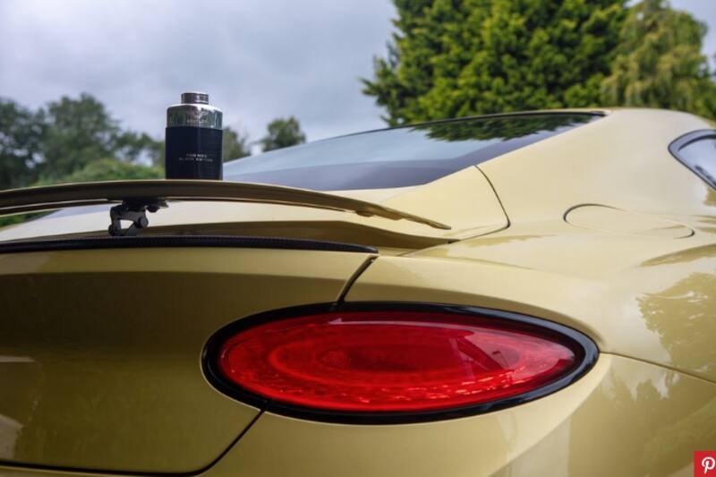 Con un pesado vidrio negro, este envase también presenta discretas rayas de color blanco plateado, hombros de metal plateado pulido con el logotipo del fabricante de automóviles grabado y una tapa plateada rodeada con el moleteado característico de Bentley que está presente en el interior de todos sus vehículos.